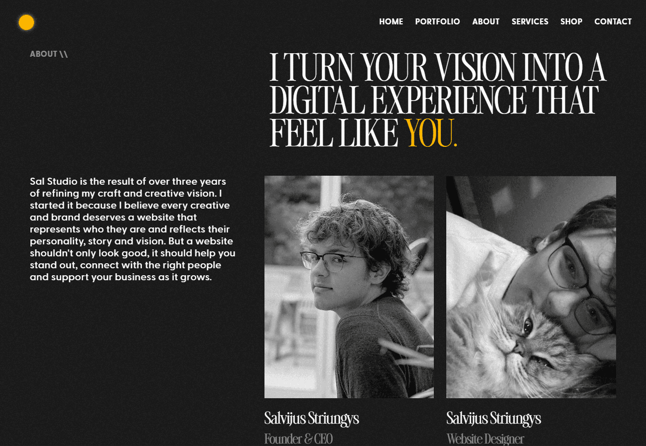 A website design studio that aims at creating digital experiences that tells a story, reflects your identity and grows your brand. The main purpose of the site is to establish Sal Studio's identity through centering the visuals and design of the site around the business owner, Salvijus Striungys whillst also positioning as a professional figure in the web design industry.
